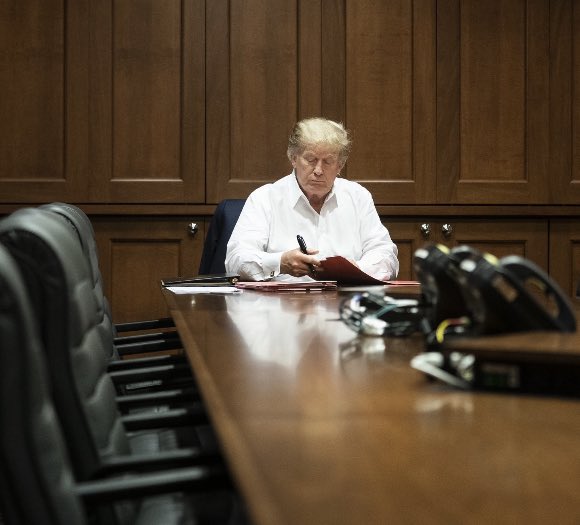 काठमाडौं। कोरोनाभाइरस संक्रमण भएपछि शुक्रबारदेखि अस्पतालमा भर्ना भएका अमेरिकी राष्ट्रपति डोनाल्ड ट्रम्पले अस्पतालमै बसेर काम गरिरहेको तस्वीरहरु अमेरिकाको राष्ट्रपति भवन ह्वाइट हाउसले जारी गरेको छ । ह्वाइट हाउसका जोयस एन बोगोसियनले राष्ट्रपति ट्रम्पका केही तस्वीर सार्वजनिक गरेका छन् ।