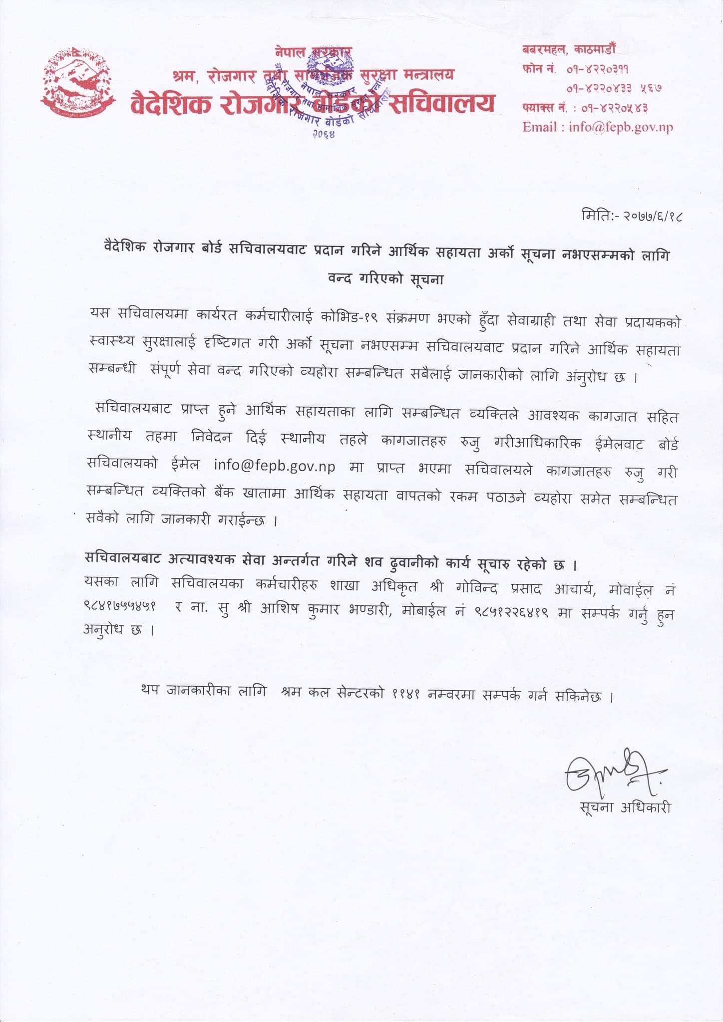 काठमाडौं । वैदेशिक रोजगार बोर्डको सचिवालयले आफ्नो सेवा बन्द गरेको छ । कार्यालयमा कार्यरत कर्मचारीमा कोरोनाको संक्रमण पुष्टि भएपछि बोर्डबाट प्रदान गरिँदै आएका आर्थिक सहायताका सेवा बन्द गरेको हो।