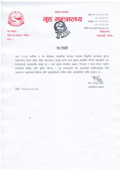गृह प्रवक्ता चक्रबहादुर बुढाले विज्ञप्ति जारी गर्दै भ्रमपूर्ण सूचना फैलिएको विषयमा अनुसन्धानसमेत भइरहेको जनाएका छन्।