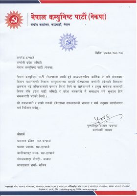 ‘सो समझदारी र हाम्रो दलको प्रदेशसभा सदस्यहरुको भावना र मर्म अनुसार कार्यान्वयन गर्न निर्देशन गर्दछु,’ विज्ञप्तिमा उल्लेख छ ।