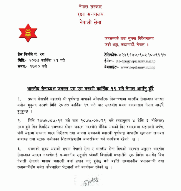 भारतीय सेनाध्यक्ष कात्तिक १९ मा नेपाल आउने, २० मा मानार्थ महारथीको दर्जा दिइने