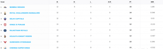 मुम्बईले अहिले सम्म खेलेको १२ खेल मध्ये ८ मा जित र ४ मा हार ब्योहोरेको छ । टोली १६ अंक र १.१८६ रनरेट सहित अंक तालिकाको शिर्षमा रहदै आफ्नो स्थान प्लेअफमा सुरक्षित गरेको छ । मुम्बईले लिगका बाँकि दुई खेलहरु जितेर आफुलाई शिर्ष स्थानमा यथावत राख्ने दाउमा रहेको छ । रोयल च्यालेन्जर बेङलोर र दिल्ली क्यापिटल्सले समान १२–१२ खेलहरु खेलेका छन । दुबै टोलीले ७–७ खेलहरु जितेका छन र दुबैको बराबर १४ अंक रहेको छ । यद्यपि रन रेटको आधारमा आरसिबी (०.०४८) टोली अंक तालिकामा दिल्ली (०.०३०) भन्दा एक स्थान माथि रहदै दोस्रो स्थानमा रहेको छ । आरसिबीले आजको खेल तथा दिल्लीले आ–आफ्नो खेल जितेमा दुबै टोलीले प्लेअफमा स्थान बनाउन सक्छ । यसो हुदा प्लेअफका लागि चौंथो टोलीको खोज सुरु हुनेछ ।