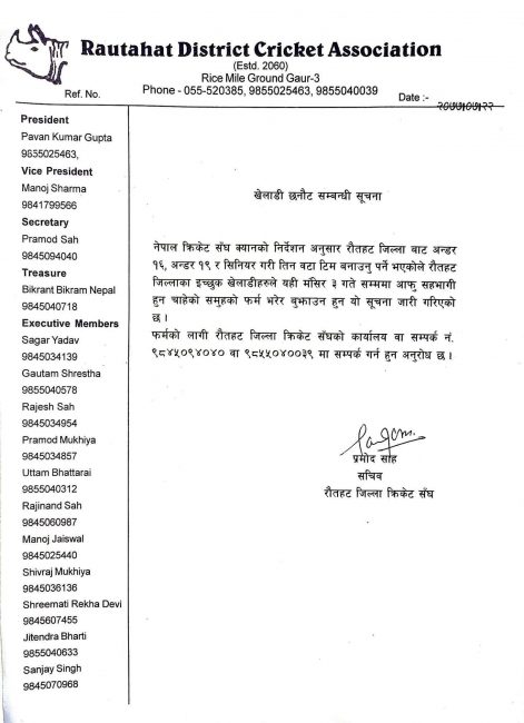 प्रदेश स्तरीय क्रिकेट प्रतियोगिताको लागि खेलाडी छनौट हुने
