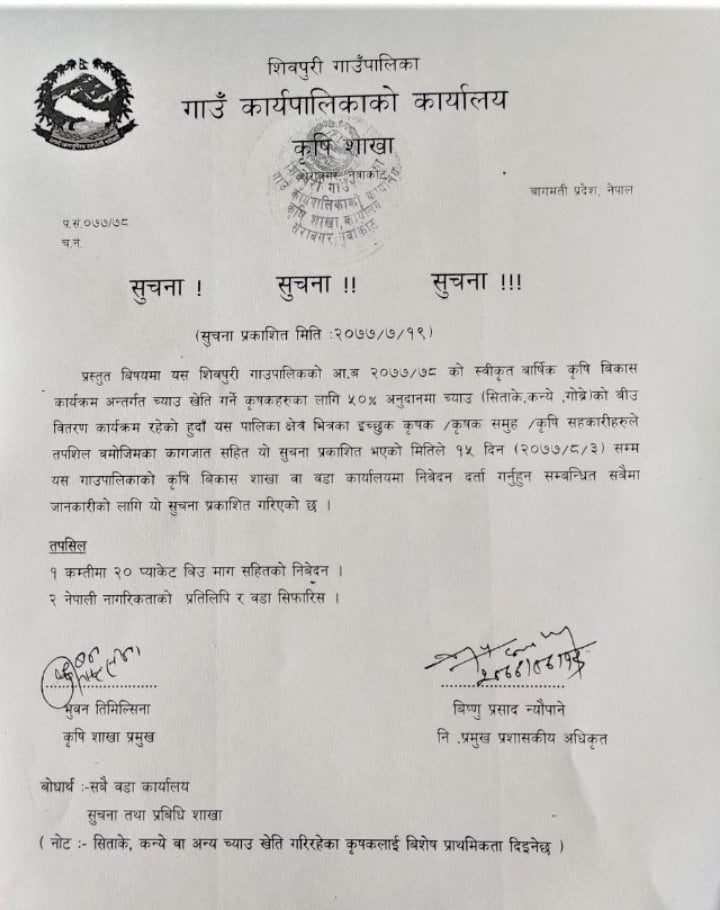 च्याउको बीउ प्राप्त गर्न ईच्छुक किसान, किसान समुह तथा सहकारीहरुले मंसिर ३ गतेभित्र कम्तिमा २० प्याकेट बीउ माग सहितको निवेदन, नागरिकताको प्रतिलिपी र वडाको सिफारिस सहित पेश गर्न गाउँपालिकाले सूचना जारी गरेको छ।