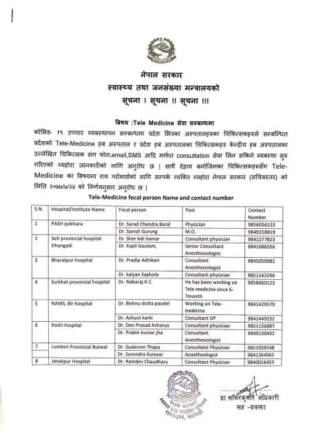 स्वास्थ्य तथा जनसंख्या मन्त्रालयले सातै प्रदेशमा एक एक वटा र केन्द्रमा एक कोरोना टेलिमेडिसिन हव सञ्चालनमा ल्याइएको जनाएको छ। मन्त्रालयले सोमबार एक सूचना जारी गर्दै परामर्श दिने ८ जना चिकित्सकहरुको नामसमेत सार्वजनिक गरेको छ।