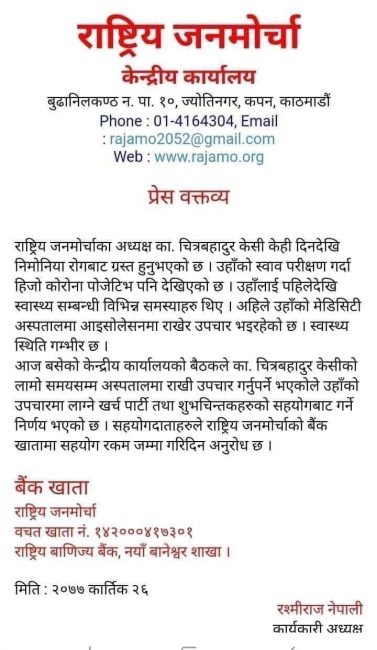 राष्ट्रिय जनमोर्चाको बुधबार बसेको बैठकले अध्यक्ष केसीको अवस्था गम्भीर रहेको भन्दै उपचारका लागि सहयोग माग्ने निर्णयसमेत गरेको छ। बैठकले उपचारका लागि सहयोग गर्न आव्हानसमेत गरेको छ।