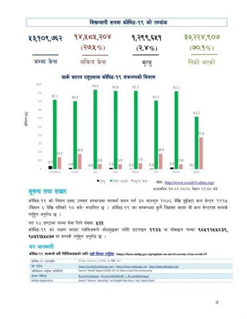 स्वास्थ्य तथा जनसंख्या मन्त्रालयका अनुसार पछिल्लो २४ घण्टामा थप ३५ सय ३७ जना कोरोना संक्रमणमुक्त भएका छन् । योसँगै नेपालमा कोरोना संक्रमण भएर निको हुनेको संख्या हालसम्म १ लाख ६८ हजार १२९ पुगेको छ ।