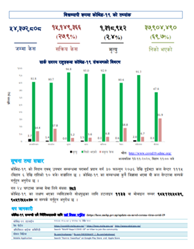 पछिल्लो २४ घण्टामा २७ सय ९८ जना निको भएका छन् । हालसम्म संक्रमणमुक्त हुनेको संख्या १ लाख ७३ हजार ४३० पुगेको छ । पछिल्लो २४ घण्टामा ६ जना थपिएसँगै कोरोनाका कारण ज्यान गुमाउनेको संख्या १ हजार २२१ पुगेको छ।