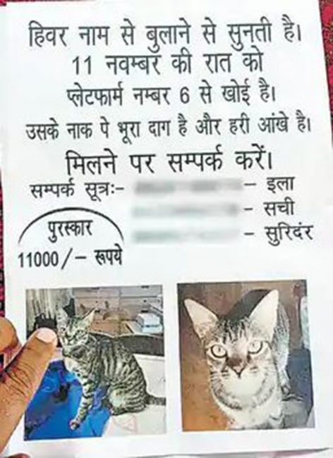 बिरालो हराएपछि निकै भावुक भएकी पूर्व आयुक्त शर्माले तत्कालै बिरालोको फोटोसहितको पोस्टर बनाएर गोरखपुर रेलवे स्टेशनका विभिन्न ठाउँमा टाँसिन् । पोस्टरमा मोवाइल नम्बरका साथै बिरालो भेट्टाउनेलाई ११ हजार भारु पुरस्कारको घोषणा गरिएको छ । पूर्व आयुक्त शर्माको बिरालो खोज्नको लागि जीआरपी र आरपीएफका जवानहरुले रातभरी प्रयास गरेका थिए । आरपीएफ इन्स्पेक्टर राजेश सिन्हाले बिरालोको खोजी भइरहेको बताएका छन् ।