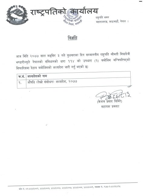 काठमाडौं। राष्ट्रपति विद्यादेवी भण्डारीले औषधि व्यवस्था ऐन संशोधन गर्न बनेको अध्यादेश जारी गरेकी छन्। एक हप्त अघि नै सरकारले सो अध्यक्षदेश जारी गर्न राष्ट्रपति समक्ष सिफारिस गरेको थियो।