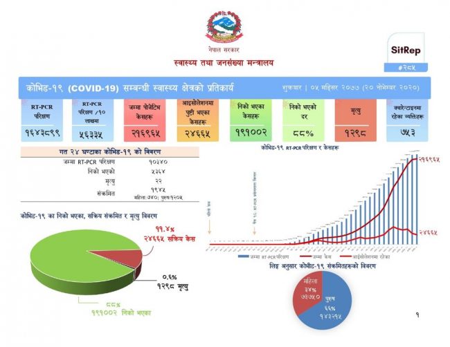 पछिल्लो २४ घण्टामा ५३ सय ६४ जना निको भएका छन् । हालसम्म संक्रमणमुक्त हुनेको संख्या १ लाख ९१ हजार २ पुगेको छ । पछिल्लो २४ घण्टामा २२ जना थपिएसँगै कोरोनाका कारण ज्यान गुमाउनेको संख्या १ हजार २९८ पुगेको छ।