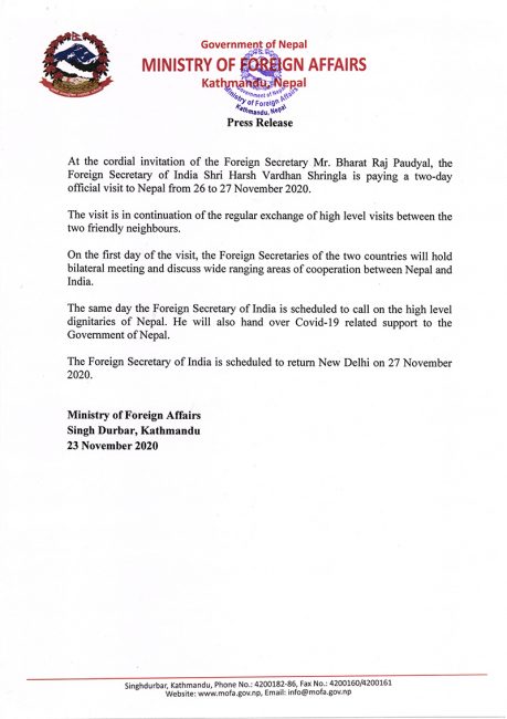 बिहीबार नै भारतका विदेश सचिवले नेपालका उच्चपदस्थ व्यक्तित्वसँग शिष्टाचार भेट गर्ने तथा कोभिड–१९ सम्बन्धी भारतीय सहायता हस्तान्तरण गर्ने कार्यक्रम रहेको मन्त्रालयले सोमबार अपराह्न जारी गरेको प्रेस विज्ञप्तिमा जनाइएको छ। विदेश सचिव श्रृंगला मंसिर १२ गते नयाँदिल्ली प्रस्थान गर्ने कार्यक्रम छ।