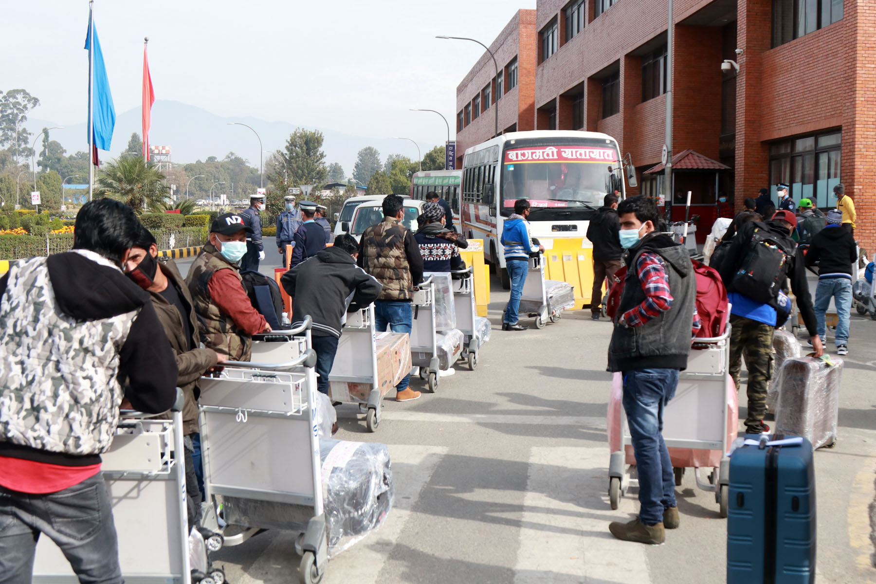 साउदी अरवबाट आएका नेपाली यात्रुहरुलाई होटल क्वारेन्टाइनमा राख्नको लागि त्रिभुवन विमानस्थल अगाडि गेटमा होल्डिङ गराउँदै । तस्वीरः प्रदीपराज वन्त, रासस