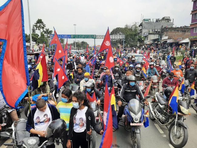बिर्तामोड । राजसंस्था तथा हिन्दुराष्ट्रको माग गर्दै राष्ट्रिय प्रजातन्त्र पार्टीको आयोजनामा झापामा शनिवार विशाल प्रदर्शन भएको छ। राप्रपाले संघीयता खारेजीको पनि माग गर्दै प्रधानमन्त्री केपी शर्माको गृह जिल्ला झापामा प्रदर्शन गरेको हो।