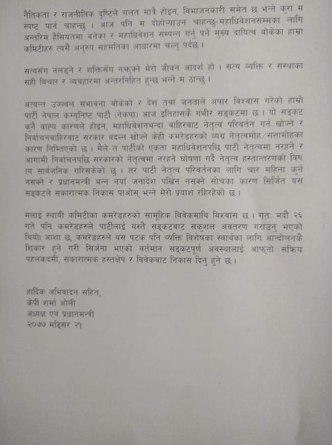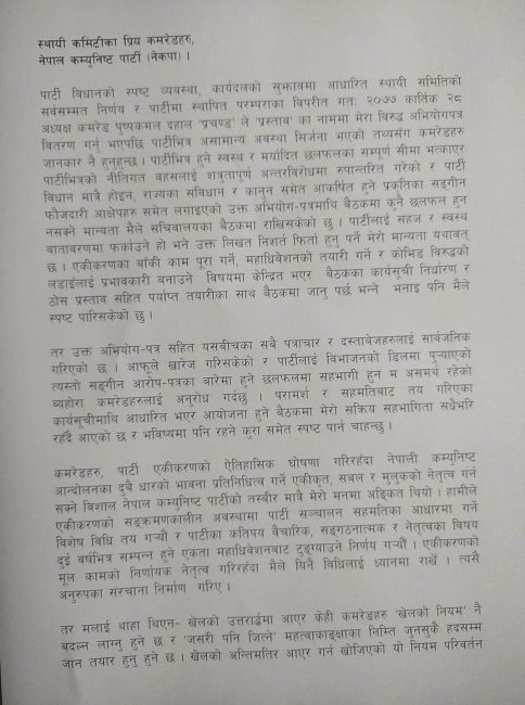 उनले विधानविपरित फौजदारी आरोपहरु लगाएर राजनीतिक प्रस्तावका नाममा अभियोग पत्र पेश गरेको र अनाधिकृतरुपमा सबै ठाउँमा वितरण गरेको पत्रमा उल्लेख गरेका छन्। ओलीले पत्रमा स्थायी कमिटी सदस्यहरुले बुद्धिमता पुर्याउनेसमेत विश्वास व्यक्त गरेका छन्।