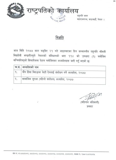 काठमाडौं। राष्ट्रपति विद्यादेवी भण्डारीले दुई अध्यादेश जारी गरेकी छिन्। आइतबार राष्ट्रपति भण्डारीले यौन हिंसाविरुद्धका केही ऐन संशोधन सम्बन्धी अध्यादेश र सामाजिक सुरक्षा ऐन संशोधन गनृ अध्यादेश जारी गरेकी हुन्। हालै बसेको मन्त्रिपरिषद्को बैठकले यी दुबै अध्यादेश जारी गर्न राष्ट्रपति समक्ष सिफारिस गरेको थियो।
