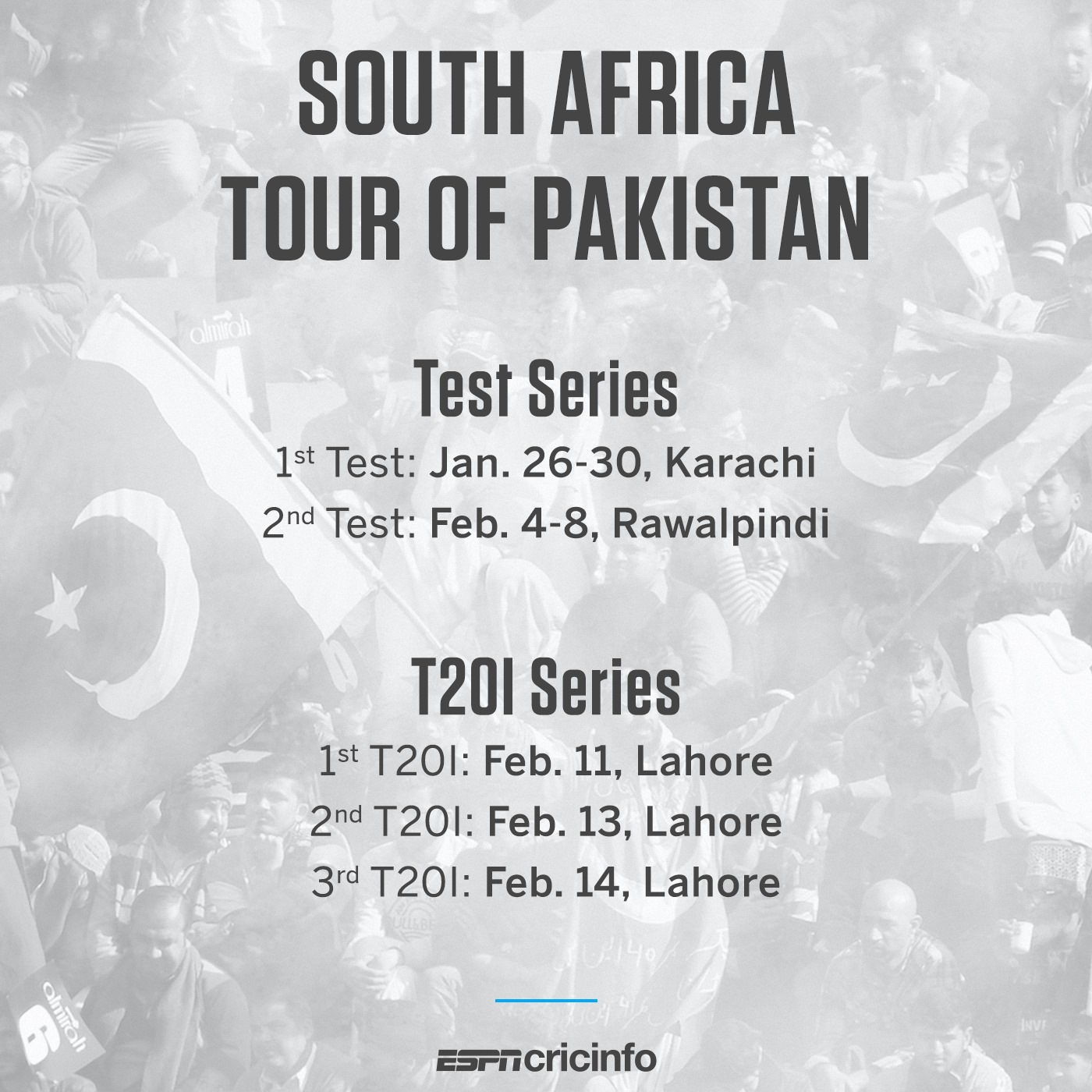 दुई टोलीबीच २ टेष्ट र ३ टी२० सिरिज हुनेछ । कराँची, रावलपिण्डी र लाहोरको मैदान खेल हुनेछ । साउथ अफ्रिकाको टोलीले अन्तिम पटक सन २००७ मा पाकिस्तानको भ्रमण गरेको थियो । त्यसपछि भने पाकिस्तानमा कुनै सिरिजको लागि अफ्रिकाको टोली गएको थिएन ।
