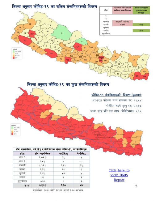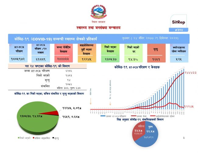 योसँगै नेपालमा कोरोना संक्रमितको कुल संख्या २ लाख ४४ हजार ४३३ पुगेको छ । स्वास्थ्य तथा जनसंख्या मन्त्रालयका अनुसार नेपालमा सक्रिय संक्रमितको संख्या १२ हजार २४५ रहेको छ ।