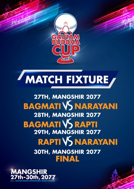 वाग्मतीको कप्तानमा राष्ट्रिय टोलीको समेत कप्तान रहेका ज्ञानेन्द्र मल्ल रहेका छन । यस्तै नारायणीको कप्तान पूर्वराष्ट्रिय कप्तान पारस खड्का र राप्तीको कप्तानमा विनोद भण्डारी रहेका छन । प्रतियोगिताको पहिलो खेलमा मङ्सिर २७ गते ज्ञानेन्द्र मल्लको वाग्मती र पारस खड्काको नारायणी भिड्नेछन् । दोस्रो खेलमा मङ्सिर २८ गते वाग्मती र विनोद भण्डारीको राप्ती भिड्नेछन् भने तेस्रो खेलमा राप्ती र नारायणी भिड्ने छन् । शीर्ष दुईमा रहने टोली फाइनलमा प्रवेश गर्नेछ । फाइनल खेल मङ्सिर ३० गते हुने अधिकारीले जानकारी दिए । कोरोना सङ्क्रमणका कारण दर्शकदीर्घा भने खाली हुने भएको छ । अधिकारीले भने, “खेल राष्ट्रियस्तरको टेलिभिजनबाट प्रत्यक्ष प्रसारण गरिने छ । दर्शकदीर्घा खाली हुनेछ ।” प्रतियोगितालाई नेपाल क्रिकेट सङ्घ (क्यान) ले प्राविधिक सहयोग गर्नेछ भने वाग्मती प्रदेश खेलकूद विकास समिति र भरतपुर माहानगरपालिकाको आर्थिक सहयोग गर्नेछ । कोभिड–१९ का कारण ठप्प रहेको क्रिकेट गतिविधिलाई पुनः चलायमान गर्दै रङ्गशालाको प्रचारका लागि प्रतियोगिता आयोजना गरिएको हो ।
