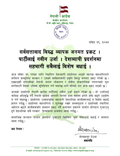 काठमाडौँ । नेपाली कांग्रेसका सभापति शेरबहादुर देउवाले आज देशव्यापीरुपमा आयोजना गरिएको विरोध प्रदर्शनले पार्टीलाई नवीन ऊर्जा प्रदान गरेको जनाएका छन् । आज साँझ विज्ञप्ति जारी गरी उनले यो ऊर्जालाई अभिवृद्धि गर्दै कांग्रेस आगामी दिनमा अझ सशक्त ढङ्गले अघि बढ्ने उद्घोष गरेका छन् ।