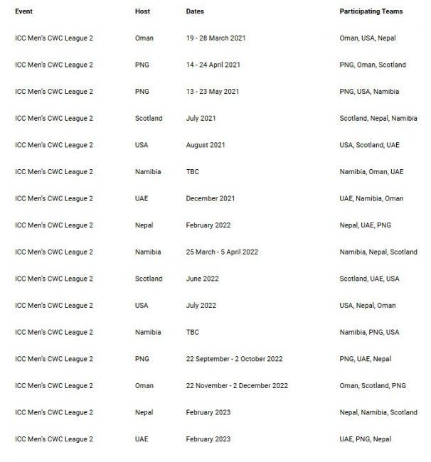 आईसीसी सुपर लिगमा १२ टेष्ट राष्ट्र र नेदरल्याण्ड गरी १३ टोली सहभागी हुनेछन् । सुपर लिगको शिर्ष आठ टोली विश्वकपका लागि छनोट हुनेछ । पूछारका पाँच टोलीले छनोट खेल्नुपर्नेछ । छनोटमा कुल १० टोली खेल्नेमध्ये सुपर लिगका पाँच, लिग २ का तीन र प्ले अफका दुई टोली सहभागी हुनेछन् । आईसीसीका अनुसार विश्वकप छनोटका खेलहरु जिम्बाबवेमा १८ जुनदेखि ९ जुलाई २०२३ सम्म खेलाइनेछ । त्यसअघि विश्वकप क्रिकेट लिग दुईका एकदिवसीय खेलहरु १९ मार्च २०२१ मा नै सुरु हुनेछ । लिग २ को छैठौं सिरिजमा ओमानले नेपाल र अमेरिका विरुद्धको खेलको आयोजना गर्नेछ । उक्त श्रृखंलामा छ एकदिवसीय खेलहरु हुनेछ । ओमान हाल १६ अङ्कसहित तालिकाको शिर्ष स्थानमा छ । यूएई भने चार अङ्कसहित पूछारमा छ । सन् २०२१ देखि २०२२ सम्म कुल ९६ एकदिवसीय खेल हुनेछ । जसमध्ये दुई खेल सन् २०२३ को सुरुवातमा खेलाइनेछ । आईसीसी लिग २ मा एकदिवसीय मान्यता पाएका कुल सात टोलीले खेल्नेछन् । ओमान, अमेरिका, स्कटल्याण्ड, नामीबिया, यूएई, नेपाल र पपुवान्यूगिनी रहेका छन् ।