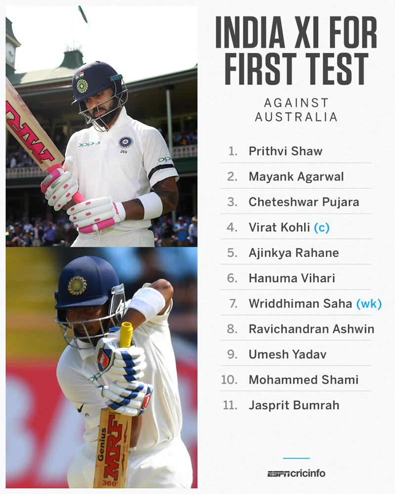 एजेन्सी ।अष्ट्रेलियाविरुद्ध पहिलो टेष्टको लागि भारतीय खेलाडीको सुची सार्वजनिक भएको छ । बुधबार बीसीसीआईले अष्ट्रेलियाविरुद्धको खेलका लागि खेलाडीको नाम सार्वजनिक गरेको हो । चार टेष्टको सिरिजअन्तर्गत बिहिबारबाट अष्ट्रेलियाको एडिलेडमा पहिलो टेष्ट सुरु हुँदै छ ।