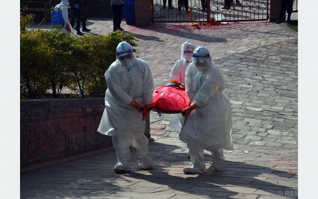 काठमाडौं । कोभिड¬१९ सङ्कट व्यवस्थापन समिति (सिसिएमसी) बाट हरेक दिनजसो नेपाली सेनाको कोभिड डेस्कमा सङ्क्रमित व्यक्तिको मृत्यु भएको खबर आइरहन्छ । मृत्युको खबर आउनासाथ नेपाली सेनाको उपत्यका पृतनाले तालीमप्राप्त सैनिक टोलीलाई तम्तयार हुन निर्देशन दिन्छ । कमाण्डरको साथमा निर्देशनप्राप्त टोली विलम्ब नगरी शव लिन हतारहतार अस्पताल पुग्छ । टोलीमा मोर्चा सम्हाल्नेमध्ये उपत्यकामा दुईवटा महिला समूह पनि सधैँ तयारीको अवस्थामा रहेका हुन्छन् ।