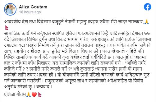 उनले लेखेकी छिन, ‘एलिजा फाउण्डेशनले छिट्टै धादिङसहित देशका ७७ वटै जिल्लाका विभिन्न दुर्गम तथा विकट भागमा गरिब, असहायहरुको लागि प्रत्येक जिल्लामा दश/दश वटा घरहरु निर्माण गर्ने कुरा जानकारी गराउन चाहन्छु ।’ उनले पहिलो चरणको काम धादिङबाट सुरु हुने जानकारी पनि गराएकी छिन्।