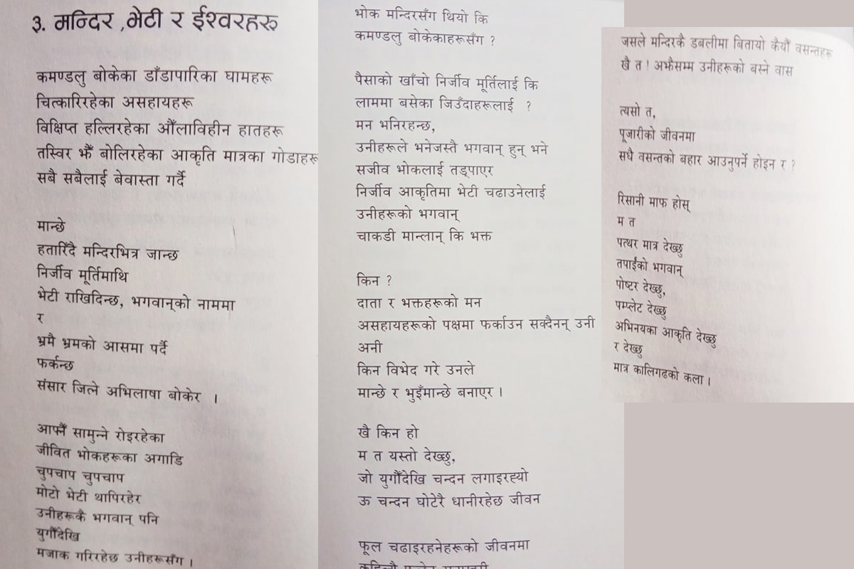त्यसो त भन्न मिल्देन। कतिपय सरल भाषामा लेखेका कविताहरु पनि राम्रा छन्। शसक्त कविता छन। तर, बिम्व कविताको एउटा अंग बनेर आउनु पर्छ भन्ने लाग्छ मलाई।