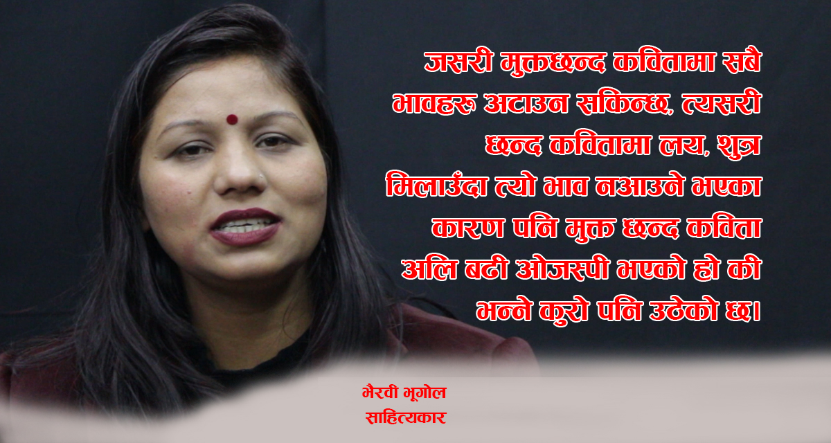 आमाले गाउने छन्द कविताका हरफहरु सुनेर हुर्केकी भैरवी मुक्त छन्दमा कविता लेख्ने कवियत्री हुन्। तर, श्रीमान बलराम दाहालले पनि छन्दमा नै कविता लेख्ने गर्छन्। सानोमा आमाले पनि छन्दमा कविता सुनाउँथिइन्, अहिले श्रीमान पनि छन्दमा कविता लेख्छन्। तर। भैरवी भने मुक्त छन्दमा कविता लेख्छिन्। साहित्यकार भैरवीसँग गरिएको कुराकानीको सम्पादित अंश :