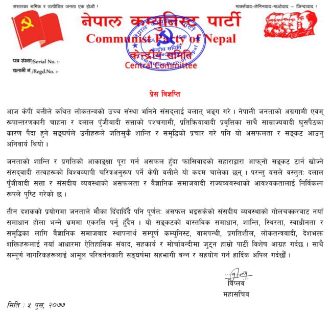 ‘जनताको शान्ति र प्रगतीको आकांक्षा पूरा गर्न असफल हुँदा फासिवादको साहाराद्वारा आफ्नो संकट टार्न खोज्ने संसद्वदी तत्वहरुको विश्वब्यापी चरित्रअनुरुप पर्ने केपी ओलीले यो कदम चालेका छन । परन्तुः यसले दलाल पूँजीवादी सत्ता र संसदीय व्यवस्थाको असफलता र बैज्ञानिक समादवादी राज्यव्यवस्थाको आवश्यकतालाई निर्विकल्प रुपले पुष्टी गरेको छ ।’ विज्ञप्तिमा उल्लेख गरिएको छ ।