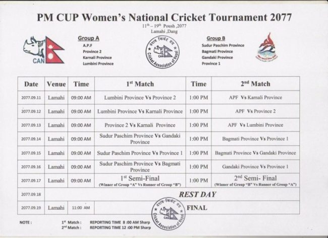 प्रधानमन्त्री राष्ट्रिय महिला क्रिकेट प्रतियोगिताको खेल तालिका सार्वजनिक