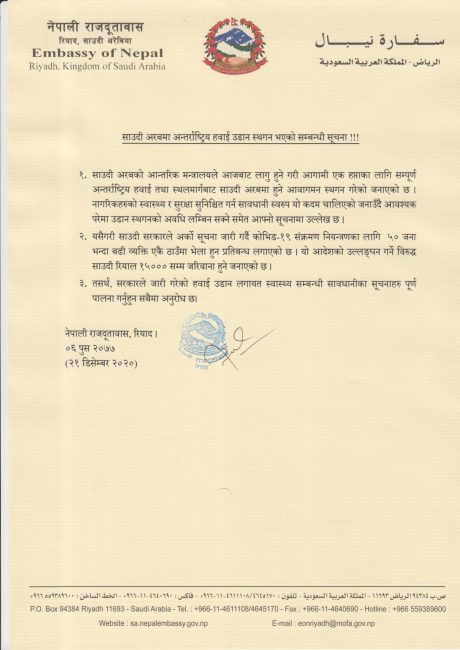 रियादस्थित नेपाली दूतावासले सूचना जारी गरी स्वास्थ्यसम्बन्धी सावधानीका सूचनाहरु पूर्ण पालना गर्न त्यहाँ रहेका नेपालीलाई आग्रह गरेको छ।