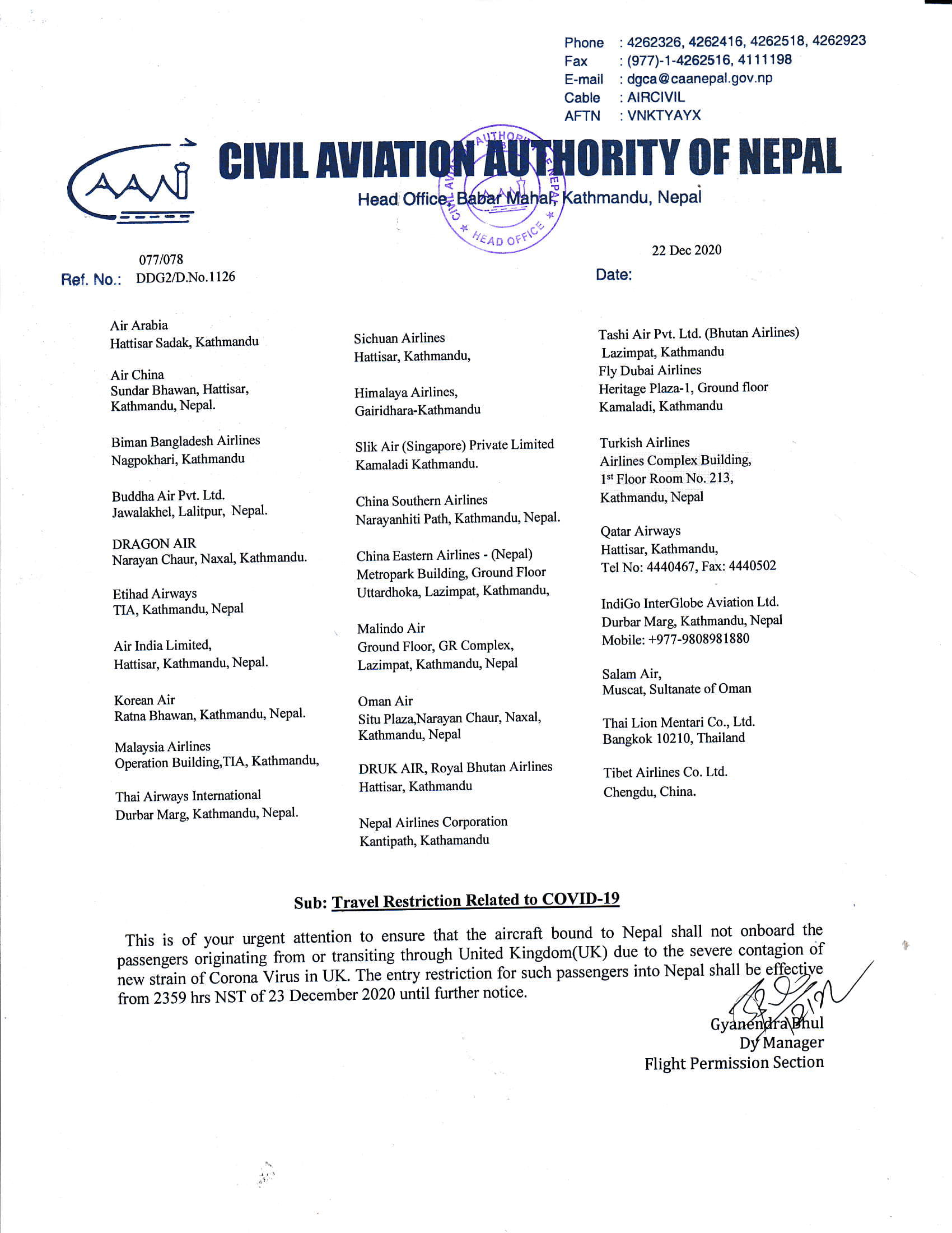 बेलायतमा कोरोना भाइरसको नयाँ प्रकार देखिएपछि नेपाल नागरिक उड्डयन प्राधिकरणले बेलायतबाट आउने कुनै पनि यात्रु नल्याउन एअरलाइन्सहरूलाई निर्देशन दिएको छ । प्राधिकरणले मंगलबार सुचना जारी गर्दै बेलायतबाट वा बेलायत ट्रान्जिट भएर आउने कुनै पनि यात्रु नबोक्न निर्देशन दिएको छ ।