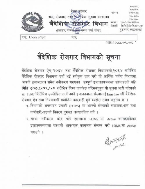 विभागले तोकिएको समयभित्र सूचना व्यवस्थापन प्रणालीमा विवरण अध्यावधिक नगर्ने ईजाजतवाला संस्थालाई निस्कृय गराई उनीहरुको कारोवार रोकी वैदेशिक रोजगार ऐन तथा वैदेशिक रोजगार नियमावलीको व्यवस्था अनुसार कारवाही गर्नेसमेत चेतावनी दिएको छ।
