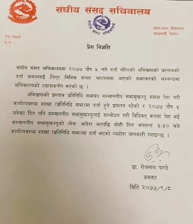संसद सचिवालयले आज जारी गरेको विज्ञप्तिमा भने उक्त प्रस्ताव सोमबार दिउँसो साढे ३ बजे मात्र संसद सचिवालयमा दर्ता भएको उल्लेख छ । विज्ञप्तिमा अविश्वासको प्रस्ताव सभामुखसमक्ष पवेश गरी प्रतिनिधिसभाको कार्यव्यवस्था शाखामा दर्ता हुने प्रावधान रहेको र सोही प्रक्रिया पूरा गरी आइतबार दिउँसो साढे ३ बजे दर्ता भएको जनाइएको छ । संसद सचिवालयका प्रवक्त डा. रोजथान पाण्डेले दर्ता भएको समयको विषयमा आएका समाचारप्रति सचिवालयको ध्यानाकर्षण भएको भन्दै दर्ता भएको समयबारे प्रस्ट पारेका हुन् ।