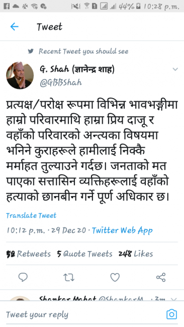 वीरेन्द्रको जन्मदिनमा ज्ञानेन्द्रको ट्वीट, वीरेन्द्रको हत्याबारे छानविन गर्न चुनौती