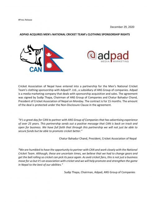 काठमाडौं । नेपाली राष्ट्रिय पुरुष क्रिकेट टोलीले प्रायोजक पाएको छ । एडप्याड सञ्चार बजार ब्यवस्थापन गर्ने कम्पनी हो । नेपाल क्रिकेट संघका अध्यक्ष चतुरबहादुर चन्दले एएनएस ग्रुप अफ कम्पनीजका अध्यक्ष सुदिप थापासँग सम्झौता पत्रमा हस्ताक्षर गरे । उक्त सम्झौता १५ महिनाको लागि गरिएको नेपाल क्रिकेट संघले जनाएको छ । क्यानले एडप्याड प्रा.लि.ले पोशाकको प्रायोजक भएपछि दिने रकमबारे खुलाएको छैन् । एडप्याडले नेपाली पुरुष क्रिकेट टोलिको जर्सीमाथि आफ्नो लोगो प्रयोग गर्न पाउनेछ ।