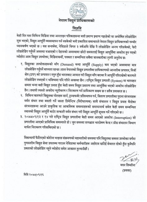 ‘नेविप्राले विगत ३ बर्षअघिदेखि नै लोडसेडिङ अन्त्य गरिसकेको, फेरी लोडसेडिङ गर्नुपर्ने अवस्था नआएको र देहायको अवस्थामा छोटो समयलाई विद्युत आपूर्तीमा अवरोध हुन गएको ब्यहोरा आम विद्युत उपभोक्ता, मिडियाकर्मी, पत्रकार र संबन्धीत सबैमा अनुरोध गरिएको छ।’ विज्ञीप्तीमा उल्लेख गरिएको छ।