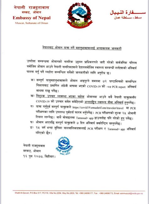 अब निःशुल्क उपचार भएका व्यक्तिबाहेक अरु सबै यात्रुले कोरोनाको उपचार समेत समेटिएको अन्तर्राष्ट्रिय स्वास्थ्य बिमा पनि अनिवार्य साथमा राख्नुपर्ने छ। यात्रा गर्नुपूर्व httpsM//covid19.emushrif.om/traveler/travel मा पीसीआर परीक्षणका लागि उपलब्ध पूर्वदर्ता फारम भर्नु पर्नेछ ।