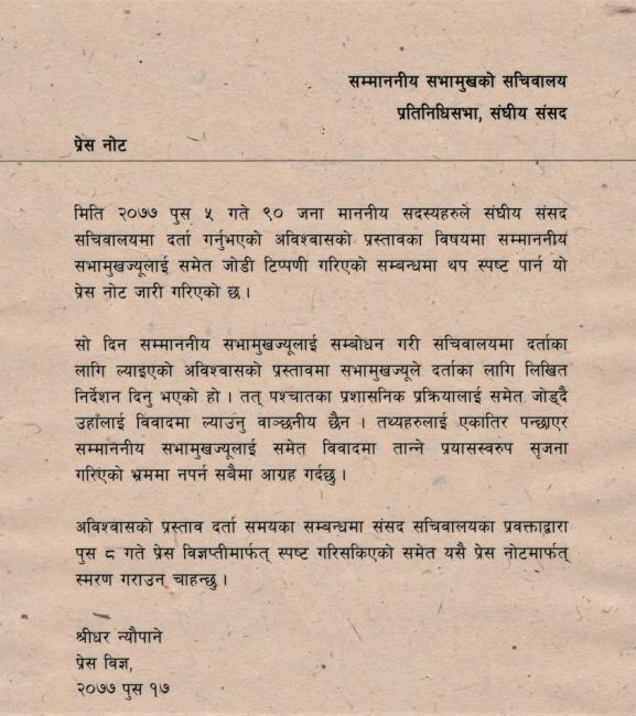तथ्यहरुलाई एकातिर पन्छाएर सभामुखलाई समेत विवादमा तान्ने प्रयासस्वरूप सिर्जना गरिएको भ्रममा नपर्न प्रेस नोटमा आग्रह गरिएको छ । अविश्वासको प्रस्ताव दर्ता समयका सम्बन्धमा संसद् सचिवालयका प्रवक्ताद्वारा यही पुस ८ गते प्रेस विज्ञप्तिमार्फत स्पष्ट गरिसकिएको समेत प्रेस नोटमा स्मरण गरिएको छ ।