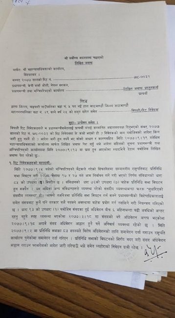 आइतबारसम्मको समय सीमा दिएर सर्वोच्चले जवाफ मागेपछि आइतबार प्रधानमन्त्री ओली तथा मन्त्रिपरिषद्को कार्यालयले महान्याधिवक्ताको कार्यलयमार्फत सर्वोच्चमा लिखित जवाफ पेश गरेका छन्।