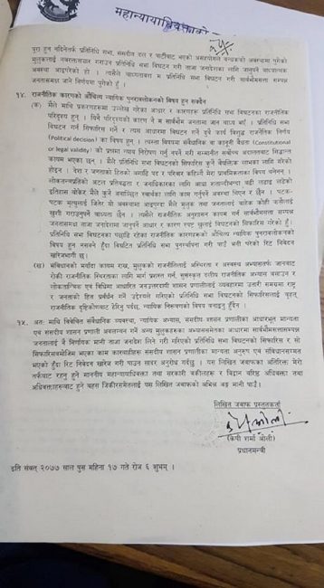 प्रधानमन्त्री ओलीले राज्य शक्तिको स्रोत जनता भएको भन्दै जनतामा जाने कुरामा कुनै दूराषययुक्त नभएको भन्दै संसद् विघटनविरुद्ध परेका सबै रिटहरु खारेज हुनुपर्ने तर्क गरेका छन्।