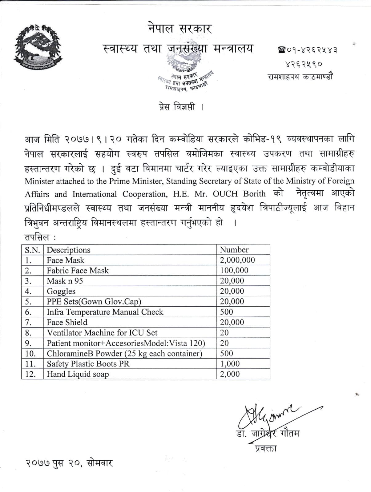 दुई वटा विमानमा चार्टर्ड गरी नेपाल ल्याइएका विभिन्न १२ किसिमका स्वास्थ्य सामग्री कम्बोडियाले हस्तान्तरण गरेको मन्त्रालयका सहप्रवक्ता समीरकुमार अधिकारीले जानकारी दिए । हस्तान्तरण गरिएका स्वास्थ्य सामग्रीमा फेस मास्क २० लाख, फेब्रिक फेस मास्क एक लाख, एन ९५ मास्क २० हजार, चस्मा २० हजार, पीपीई सेट २० हजार, फेस शिल्ड २० हजार, सेफ्टी प्लाष्टिक जुत्ता एक हजार र थर्मल गन ५०० थान रहेका छन् । सो अवसरमा मन्त्री त्रिपाठीले सहयोगका लागि कम्बोडियाको सरकारलाई सहयोगका लागि नेपाल सरकारका तर्फबाट धन्यवाद दिए ।