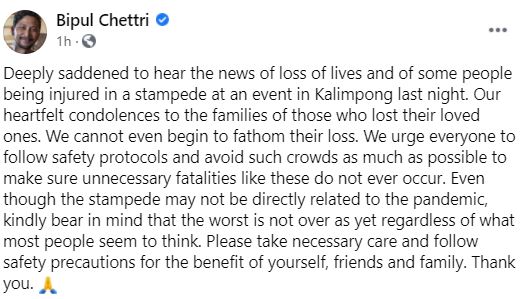 घटनापछि दार्जिलङबाट भाजापा सांसद राजु विष्टले पश्चिम बंगालकी मुख्यमन्त्री ममता बनर्जीलाई एक निवेदन लेखेर घटनाबारे छानविन गर्न आग्रह गरेका छन्। उनले कोरोना महामारीका बेला स्वास्थ्य मापदण्ड नअपनाई कन्सर्ट गर्न स्थानीय प्रशासनले अनुमति दिएको समेत बताएका छन्। उनले कन्सर्टमा प्रहरीले लाठी चार्ज गर्दा भागदौड भएको र सो क्रममा दुईजनाको मृत्यु भएको बताएका छन्।