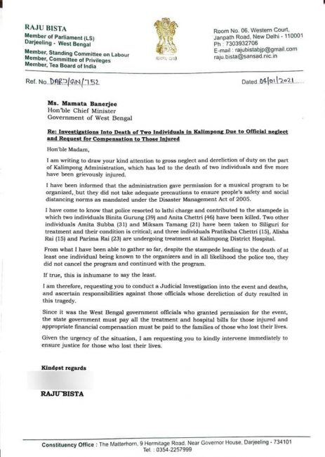 Darjeeling MP @RajuBistaBJP writes to Bengal CM Mamata Banerjee over the death of two people due to stampede in Kalimpong yesterday evening. MP demands investigation into the death & compensation for the injured. https://t.co/s1ggRqIlqU pic.twitter.com/EgXsCEI5UC