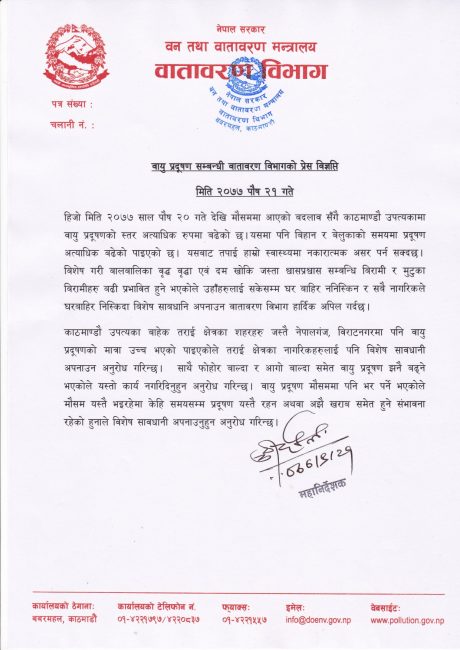 विभागले मंगलबार दिउँसो विज्ञप्ति जारी गर्दै भनेको छ, ‘उपत्यकामा बिहान र बेलुकीको समयमा प्रदुषण अत्यधिक बढेको पाइएको छ । यसबाट तपाईं हाम्रो स्वास्थ्यमा नकरात्मक असर पर्न सक्दछ । बिरामीहरू बढी प्रभावित हुने भएकाले उहाँहरूलाई सकेसम्म घर बाहिर ननिस्किन र सबै नागरिकले घरबाहिर निस्किँदा विशेष सावधानी अपनाउन आग्रह गर्दछौं।’