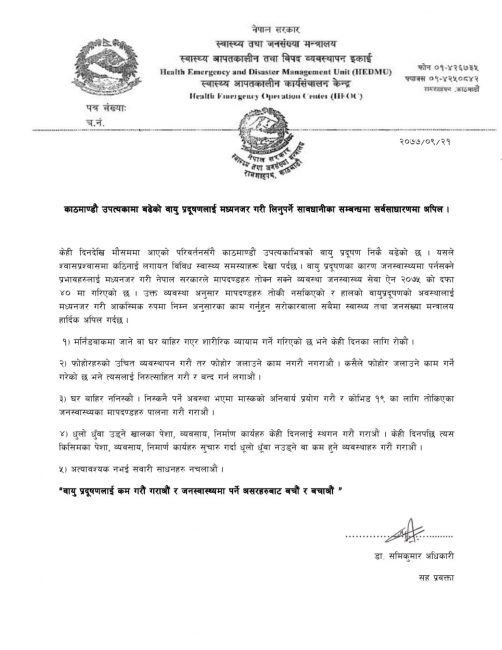 सोमबार विश्वका ५० सहरमध्ये प्रदूषणका हिसाबले काठमाडौं १ नम्बरमा रहेको देखिएको थियो। काठमाडौं उपत्यकामा वायु प्रदूषण बढेसँगै स्वास्थ्य तथा जनसंख्या मन्त्रालयले पनि सर्वसाधारणलाई घरबाट बाहिर ननिस्कन अपिल गरेको छ ।