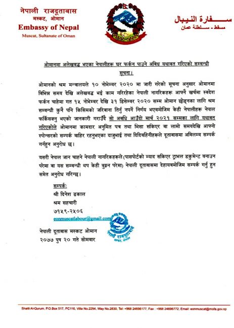 यसरी नेपाल आउन चाहने नेपाली नागरिकहरूले (पासपोर्टको म्याद सकिएर ट्राभल डकुमेन्ट बनाउन परेमा वा यससम्बन्धी थप केही बुझ्न परेमा) नेपाली मस्कटस्थित नेपाली दूतावास र दिनेश ढकाल श्रम सहचारीसँग सम्पर्क गर्न दूतावासले अनुरोध गरेको छ।