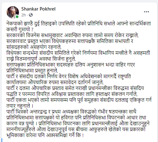यसैक्रममा प्रधानमन्त्री ओलीका निकट र लुम्बिनीका मुख्यमन्त्री शंकर पोखरेलले बुधबार साँझ फेसबुकमा लामो स्टाटस लेख्दै प्रतिनिधिसभा असान्दर्भिक भएकाले विघटन गरिएको तर्क पेश गरेका छन्।